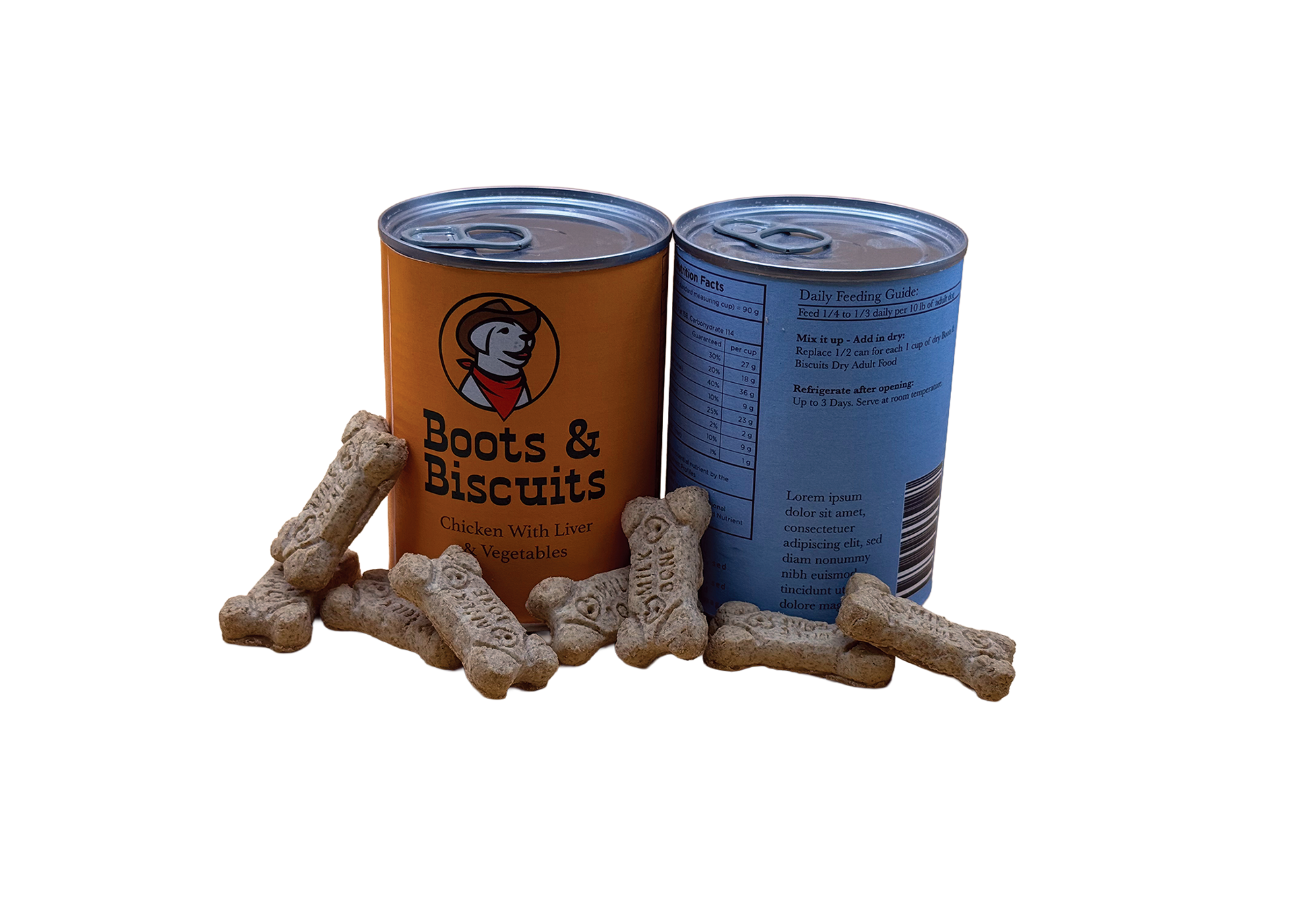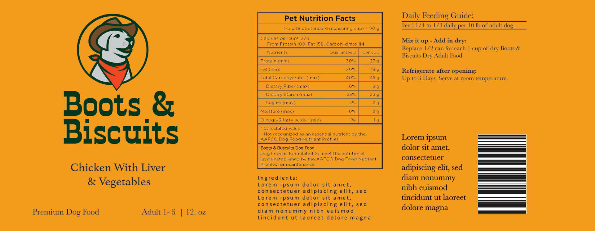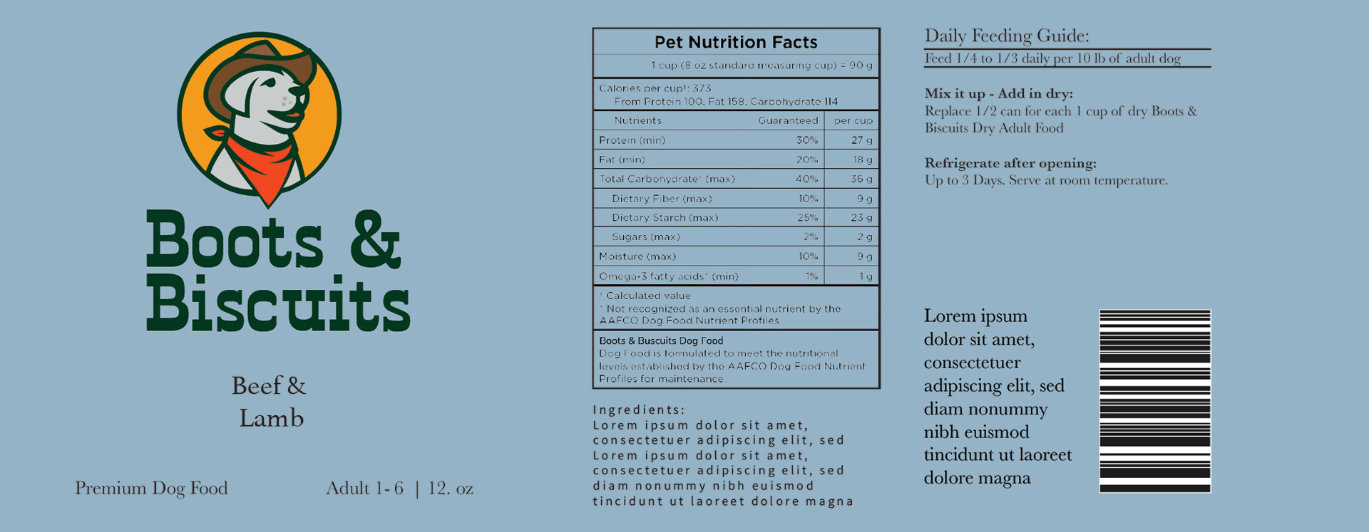 A dog food brand with a Western theme. They wanted wet food can labels and a treat stand-up pouch. I created the whole brand and took all the photos.